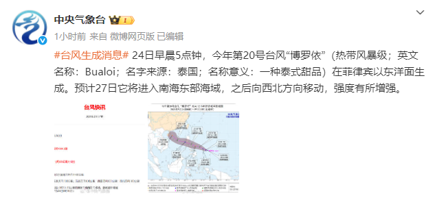 据@中央气象台消息:今晨5时,今年第20号台风“博罗依”(热带风暴级;英文名称:Bualoi;名字来源:泰国;名称意义:一种泰式甜品)在菲律宾以东洋面生成。预计27日它将进入南海东部海域,之后向西北方向移动,强度有所增强。