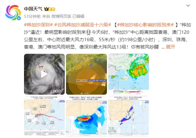 据@中国天气消息:今天6时,“桦加沙”中心距离我国香港、澳门120公里左右,中心附近最大风力16级,55米/秒(约198公里/小时),深圳、珠海、香港、澳门等地风雨明显,像深圳最大阵风达13级!你有被风吵醒吗?