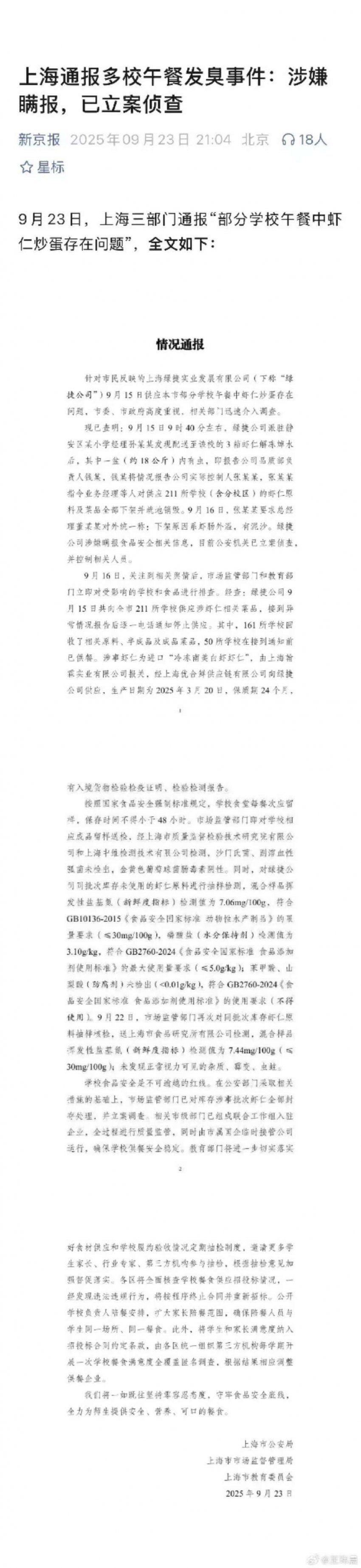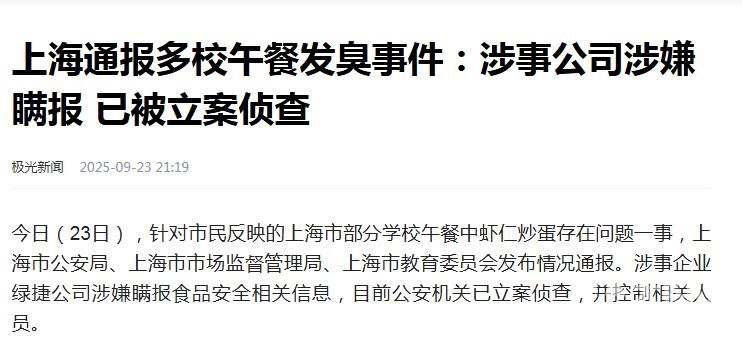 上海通报多校午餐发臭事件:涉事公司涉嫌瞒报 已被立案侦查