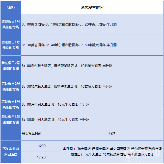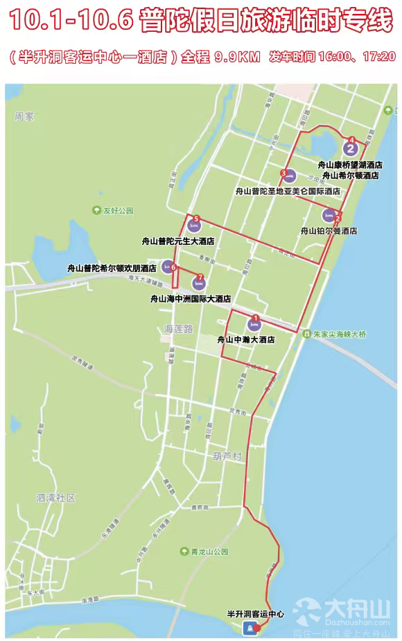途经站点:舟山普陀圣地亚美仑国际酒店-舟山普陀希尔顿欢朋酒店-舟山中瀚大酒店-半升洞客运中心