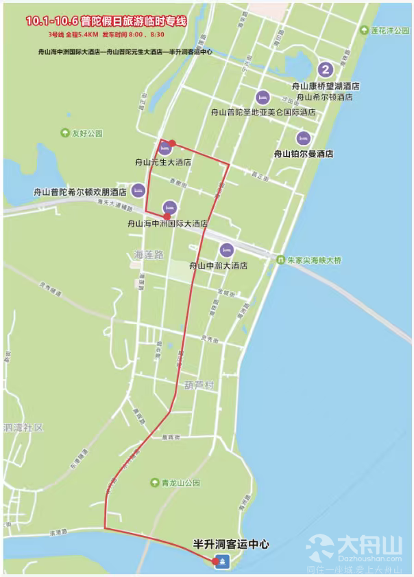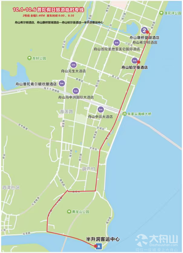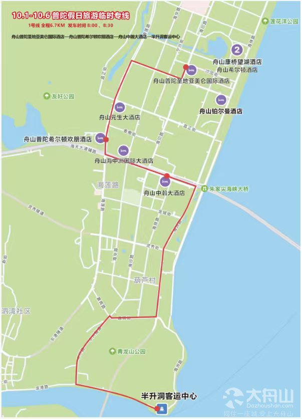 途经站点:半升洞客运中心-舟山中瀚大酒店-舟山铂尔曼酒店-舟山普陀圣地亚美仑国际酒店-舟山希尔顿酒店、舟山康桥望湖酒店-舟山元生大酒店-舟山普陀希尔顿欢朋酒店-舟山海中洲国际大酒店