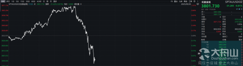 刚刚,现货金银快速下跌,现货黄金盘中向下跌破3800美元/盎司,日内下跌超0.8%,此前盘中一度大涨1%刷新记录新高至3871美元/盎司。现货白银跌1.88%,报46.02美元/盎司。