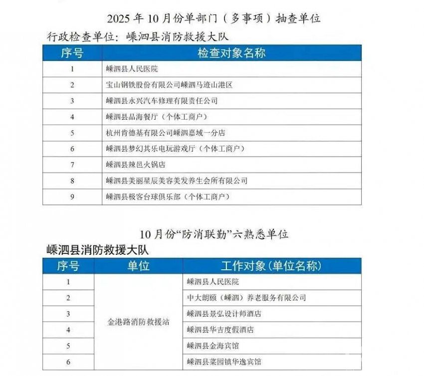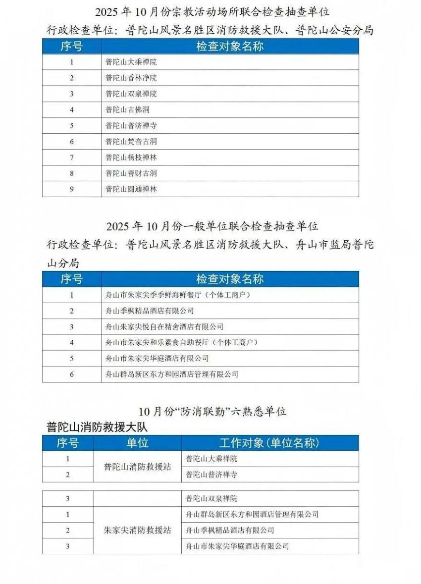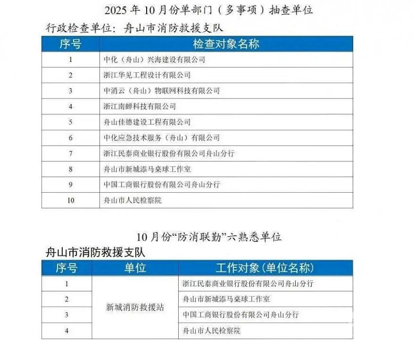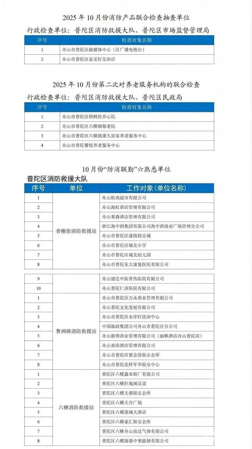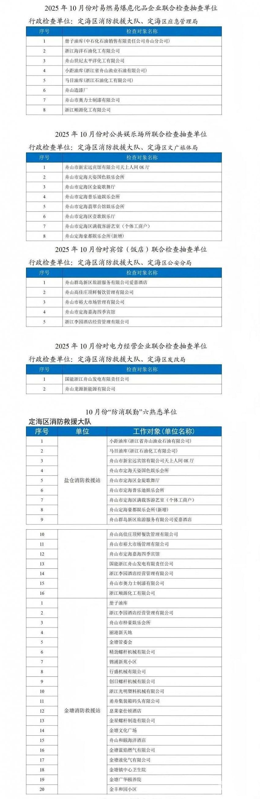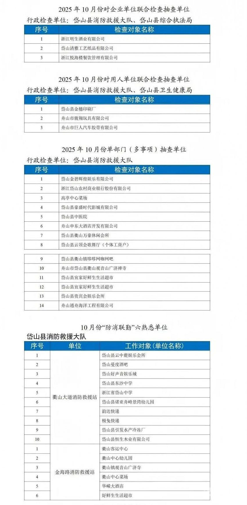 近日,舟山市10月份消防领域跨部门联合抽查、单部门(多事项)抽查和“防消联勤”计划公布,以下单位将被随机抽查。
