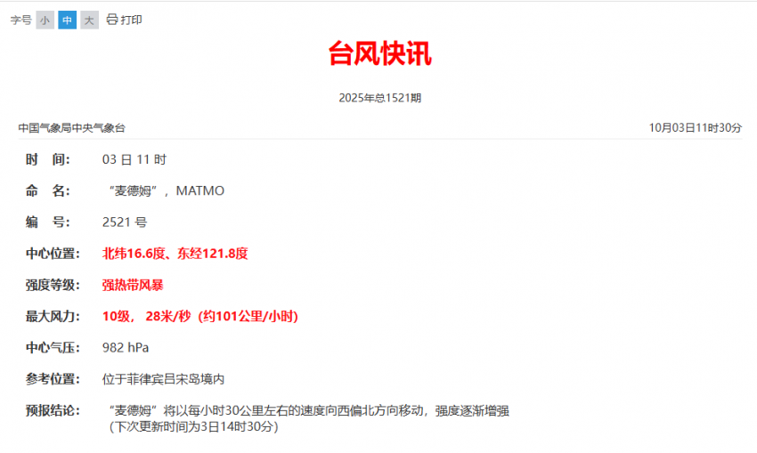 据中央气象台消息:今年第21号台风“麦德姆”(强热带风暴级)今天(3日)上午8点钟位于菲律宾吕宋岛东部近海,中心最低气压为982百帕,七级风圈半径为200-250公里,十级风圈半径为50-60公里。