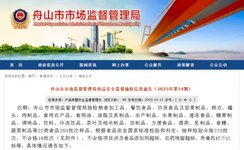 对抽检中发现的不合格产品,我局要求定海、普陀、嵊泗、普陀山等地的市场监管部门督促食品经营环节有关单位立即采取下架等措施控制风险。以上核查单位自通告发布之日起7日内向社会公布风险防控措施,3个月内向舟山市市场监督管理局报告核查处置情况并向社会公布。特此通告。