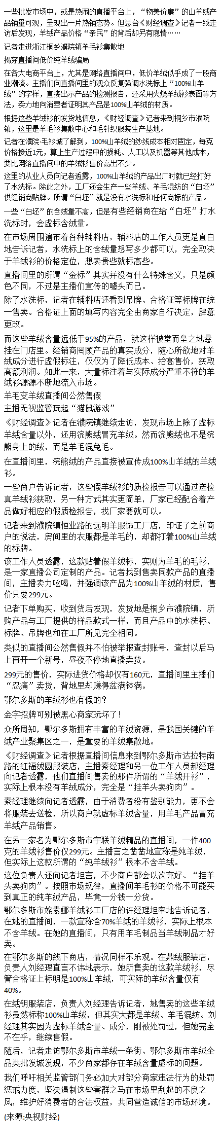 含绒量随意写、羊毛变羊绒!低价纯羊绒骗局曝光