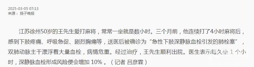大叔连打4小时麻将血栓了 久坐1小时血栓风险增加10%