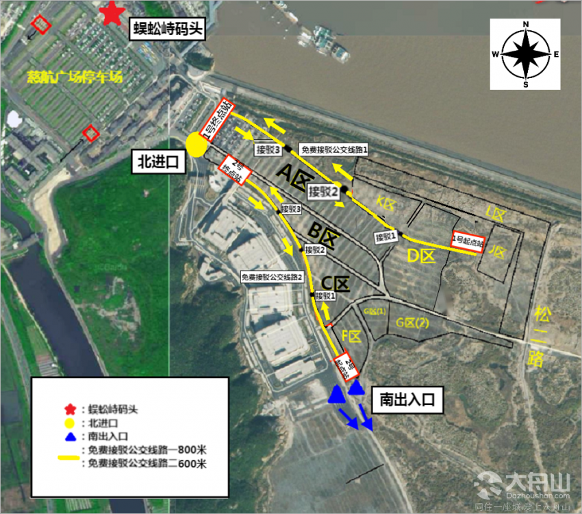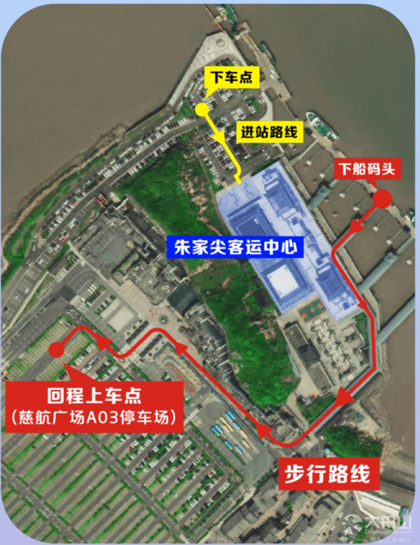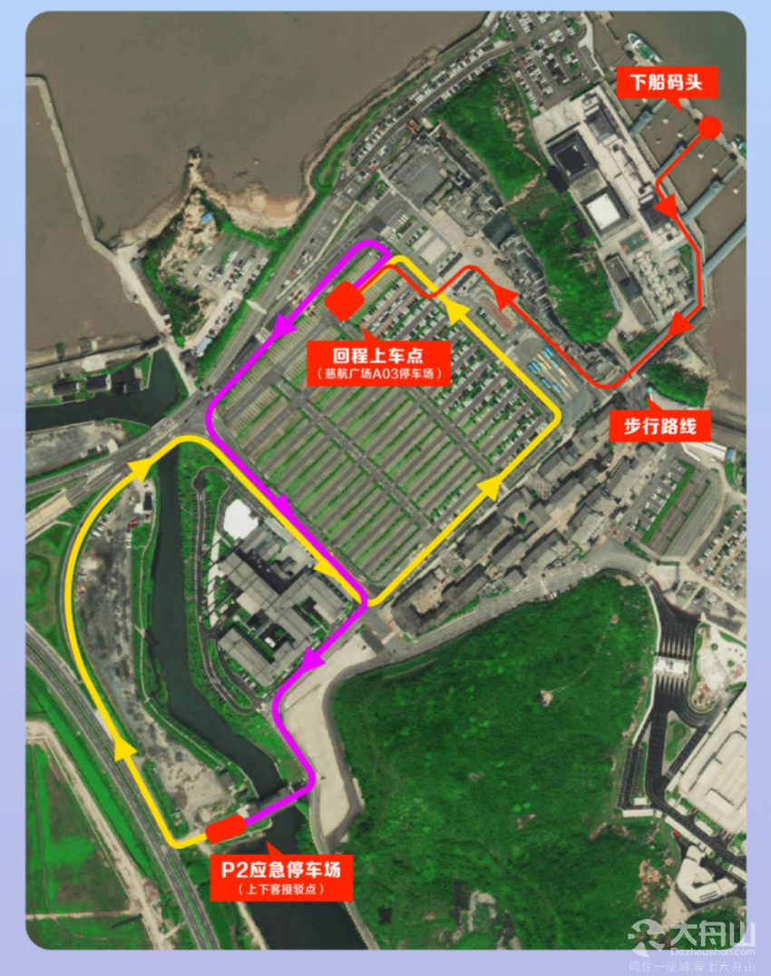 开通本岛大型停车场-慈航广场的公交接驳专线,直达朱家尖蜈蚣峙码头内停车场。乘客需在普陀山景区门票预约平台上提前预约,即可享受公交接驳绿色出行专用通道,免除站外排队。