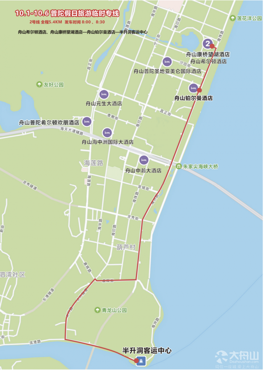 普陀假日旅游2号线:舟山希尔顿酒店、舟山康桥望湖酒店-舟山铂尔曼酒店-半升洞客运中心
