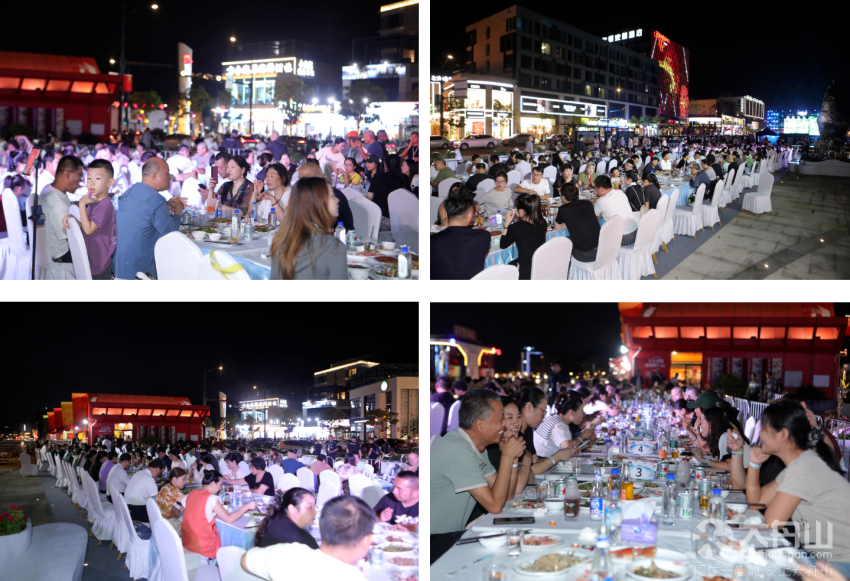 当晚,鳌鱼广场还举办了百人海鲜长桌宴, 红虾白煮、齐鱼油炸、白蟹清蒸、炒米面、芹菜炒鳗鲞、杂鱼红烧等特色海鲜菜肴依次排开,吃客们一边吹着海风,一边品尝最地道的舟山味。