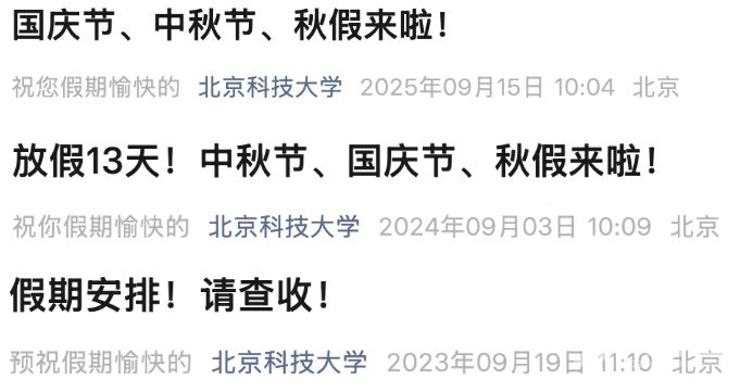 近日,“北京科技大学”微信公众号发文称,2025年9月28日(星期日)不调休,放国庆节、中秋节、秋假直至10月8日(星期三),共11天。