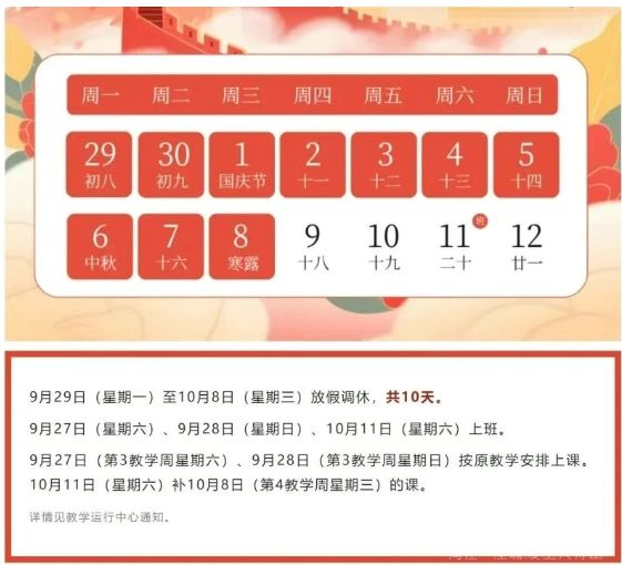 其通知称,9月29日至10月8日放假调休,共10天。9月27日(第3教学周星期六)、9月28日(第3教学周星期日)按原教学安排上课。10月11日(星期六)补10月8日(第4教学周星期三)的课。