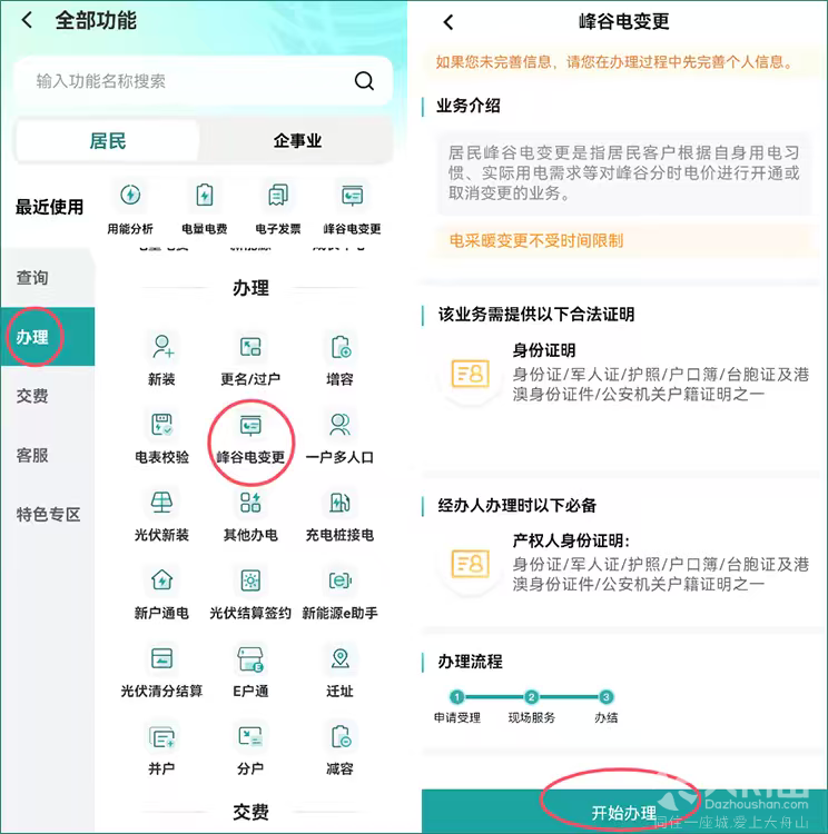 网上国网App首页点击【更多】-【办理】-【峰谷电变更】,根据提示上传相关资料并提交,然后等待工作人员联系就可以了。