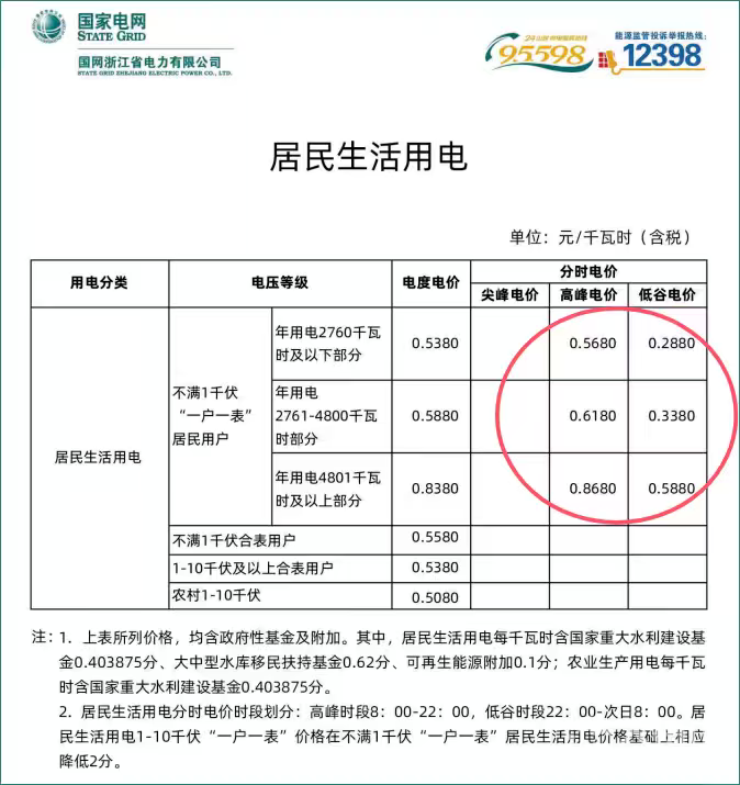 目前浙江省对不满1千伏“一户一表”的居民用户,实行阶梯电价制。峰谷电电价如下↓