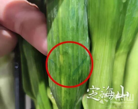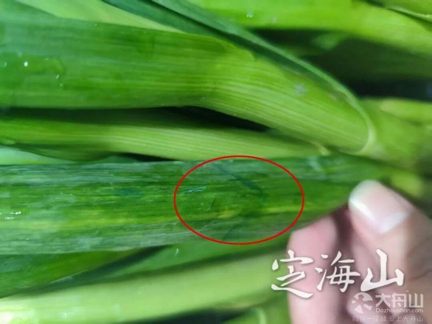 发现定海凯虹广场城市超市已下架大蒜, 部分市场的个别大蒜叶上确实有蓝色划痕,但未发现蓝色结晶。
