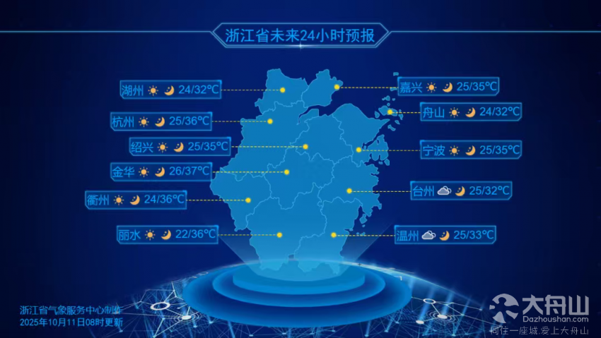 后天:全省晴到多云,浙中北地区午后有分散性雷阵雨。