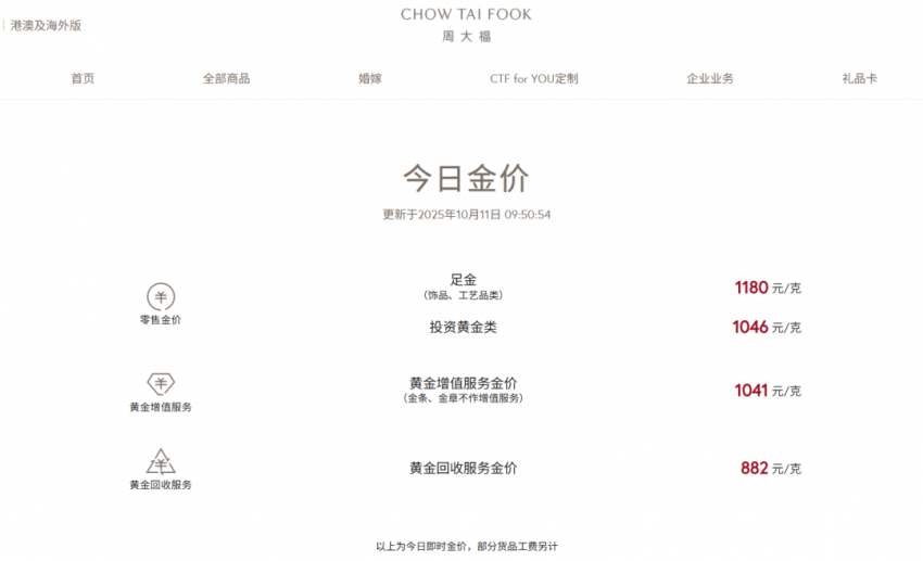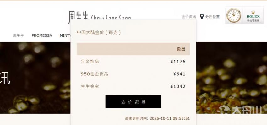 周大福、六福珠宝足金饰品为1180元/克,周生生足金饰品为1176元/克,均有明显上涨。