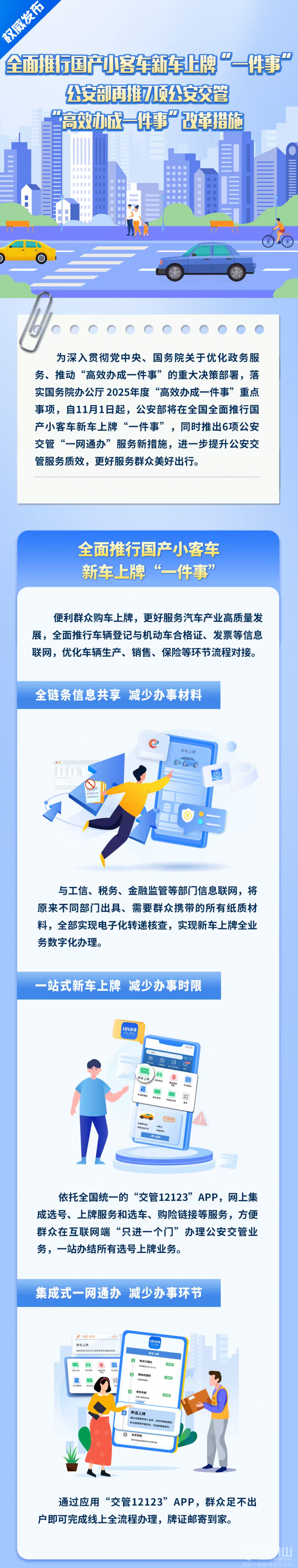 据了解,公安部11月1日起实施7项公安交管“高效办成一件事”改革措施,包括推行国产小客车新车上牌“一件事”服务、网上办理解除机动车抵押登记、网上办理大件运输车辆临时号牌、网上补换领机动车登记证书、机动车转籍信息网上转递、便利网上办理驾驶人考试业务、网上申请校车驾驶资格。