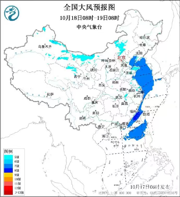 10月18日(周六):阴有阵雨或雷雨;23-29℃;北到东北风5-6级阵风7级,中午增强到7-8级阵风9级,傍晚起8级阵风9-10级,半夜起7-8级阵风9级。