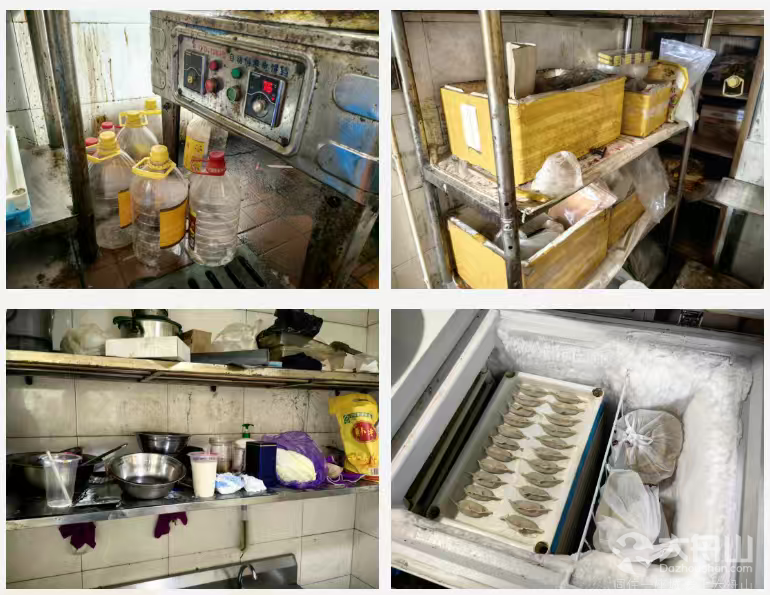 1、后厨场所、设施设备不洁,存在大量油污、积垢。