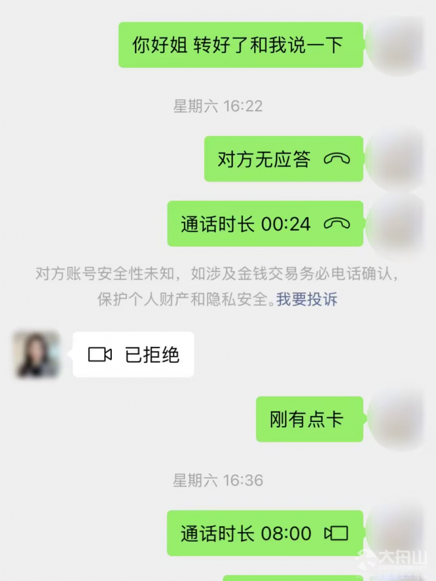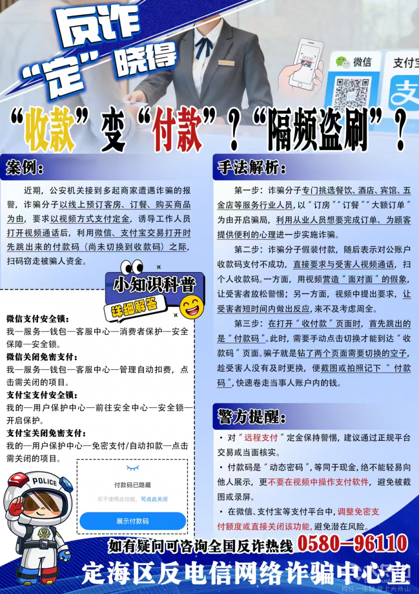 同日16时许,定海某餐厅员工胡某接到一个订餐电话,对方预算2000元,随后让胡某加了一个微信号码。当谈及付款时,对方先让胡某发他支付宝收款码,然后以“扫不出码”为由,要求开视频通话。