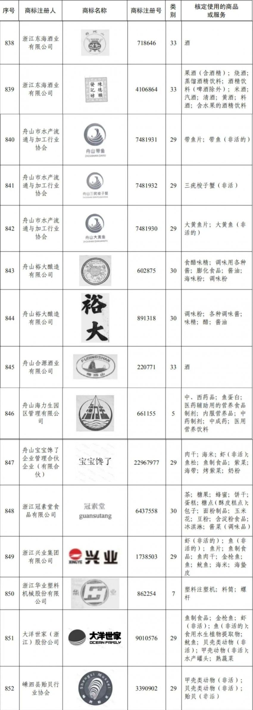 此次入选的商标中,有承载地方特色的地理标志商标,如舟山带鱼、嵊泗贻贝等;有公众所熟知的驰名商标,如兴业、冠素堂等;也有深耕行业多年的老字号商标,如裕大、佛顶山、陈德顺发记坊等。
