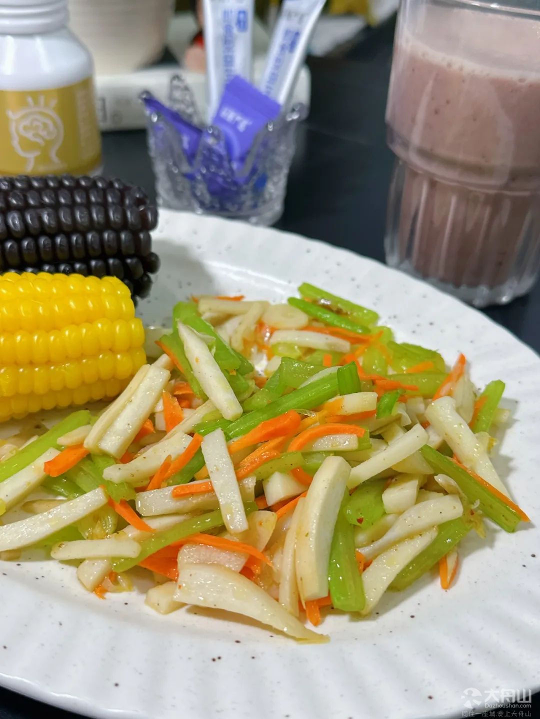 早餐:山药红枣黑米豆浆,芹菜炒杏鲍菇红萝卜,黑玉米
