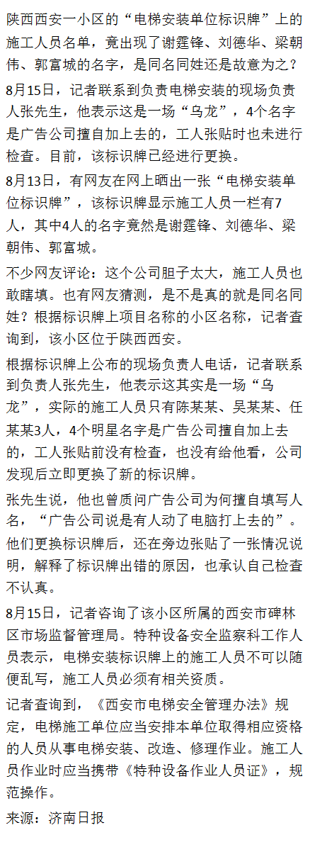 电梯施工人员名单出现多个明星名字?当地市监局:不能随便乱写!