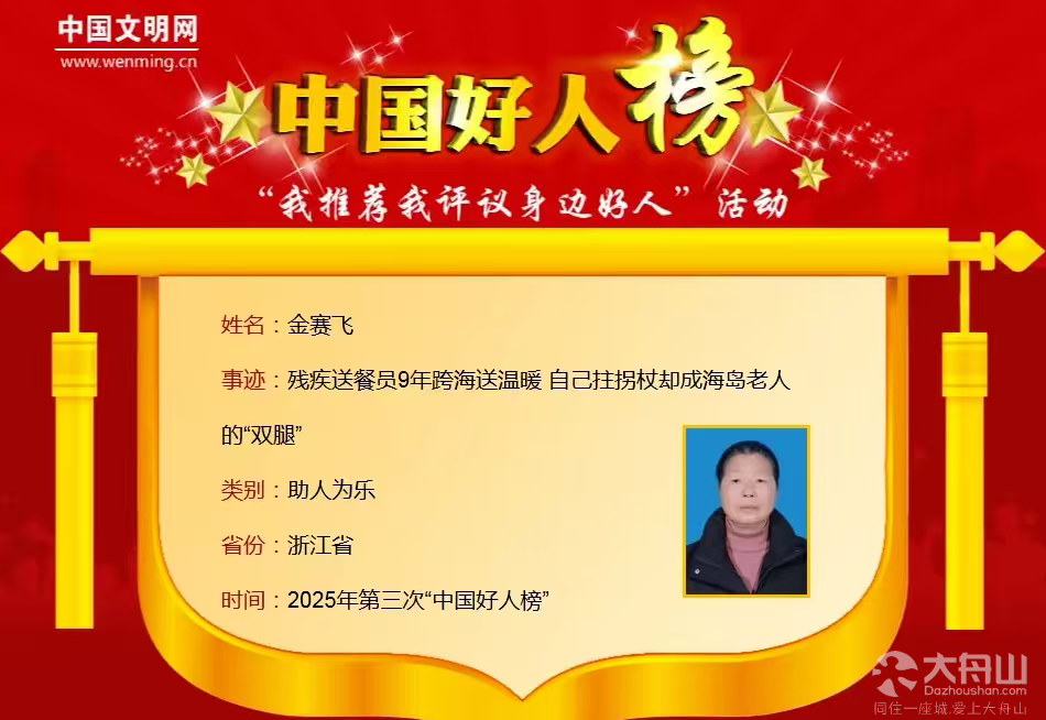 刚刚公布!舟山金赛飞,获评“中国好人”!